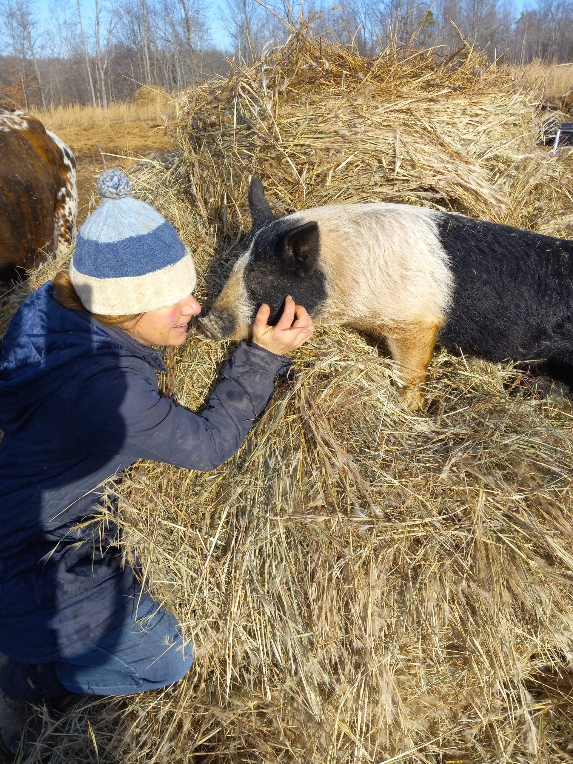 I like to run my homestead with a permaculture approach where the animals need to WORK to earn their keep. Although my animals have names and get treats, they aren’t pets…kind of haha! The cows job is to fertilize the land and regenerate the soil while providing us with the most nutrient dense beef available. My Pinewoods steer (castrated cow), Basil was aware of this and then he reminded me that there is also another job Pineywoods Cattle can perform by pulling heavy loads as an ox. So I have been reading a book on how to train oxen and working with the cows every morning on the homestead. Emma, the pig got word of Basil’s scheme and she to decided she didn’t want to go to freezer camp. She decided that is she was SUPER tame and let me pet her like a dog, she could ham it up a different way…sorry folks we will have significantly less pastured pork this fall. Emma the pig said she’s now a pet here at Healing Homestead.