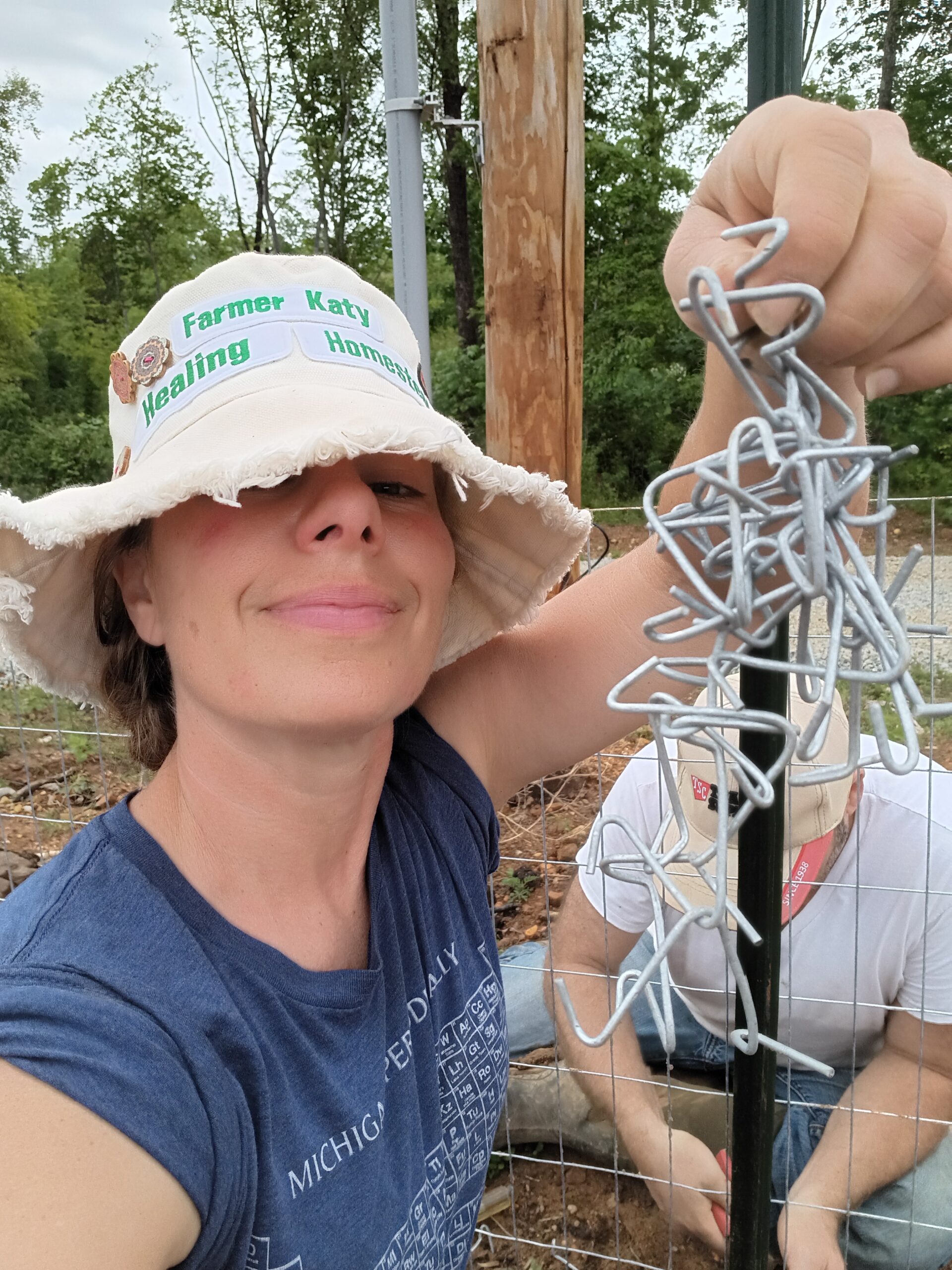 When you have free range chickens, ducks, geese, guineas, turkeys, and peacocks that means you better have a tall fence to keep them out of the garden! We decided to use eight foot t-post instead of six foot. The bottom three feet is a two inch by four inch welded wire that we overlapped with 6 feet of deer netting. We have so many deer in the area that our creek is named the Buck Branch.