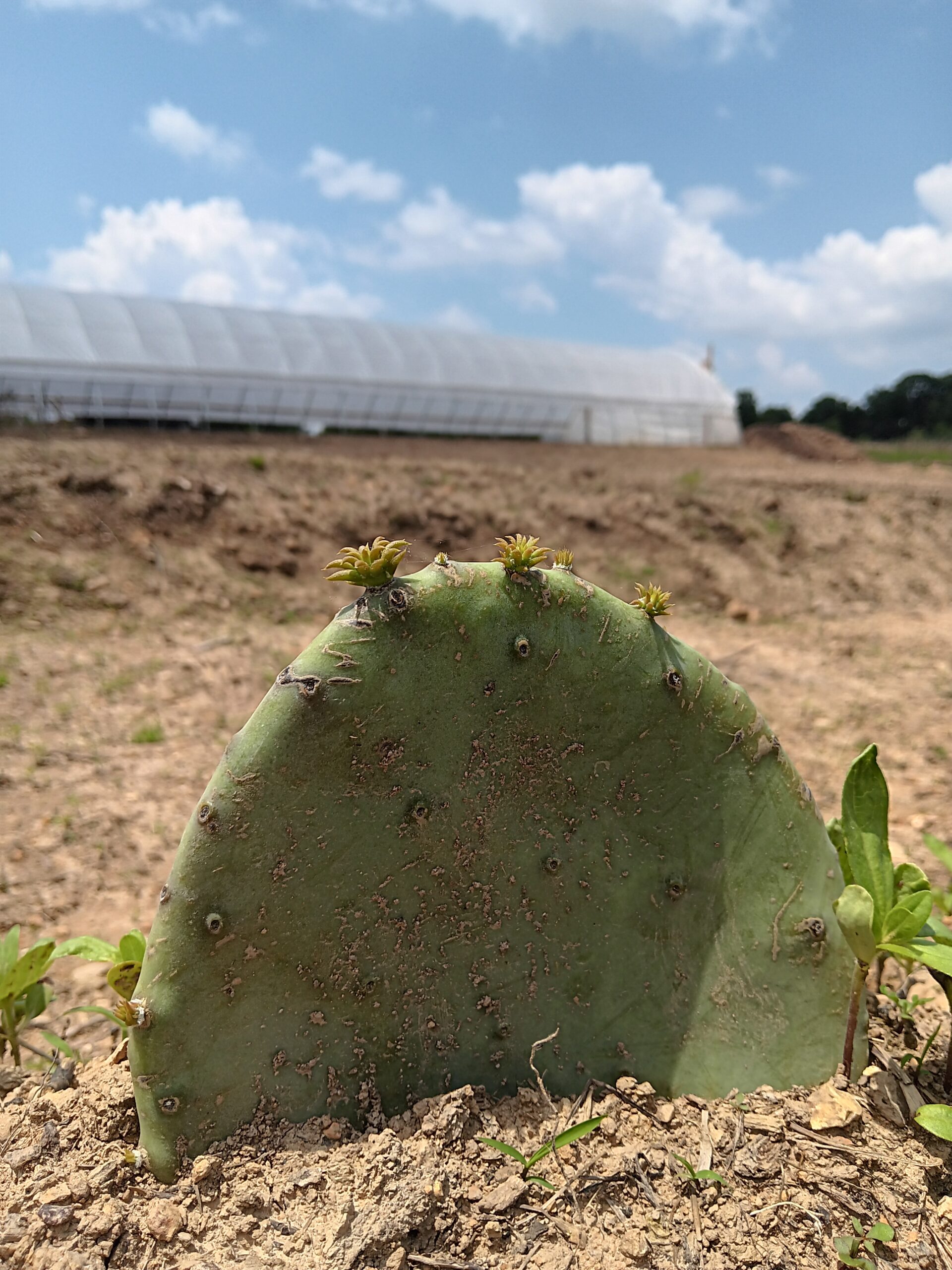 - Propagating cactus leaves in front of the hoop house.